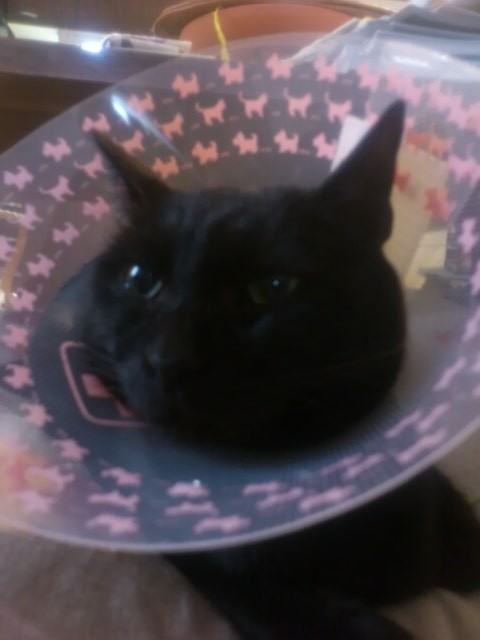 M4号のお尻におできができたので、ぺろぺろなめるといけないので”エリザベス”を付けました。餌は食べにくい、水は飲みにくい、狭い家でいろいろなものにぶつかる、などなど、ストレスの種は尽きず、かわいそうですが仕方ありません。それにしてもピンクの似合わない顔の男です。