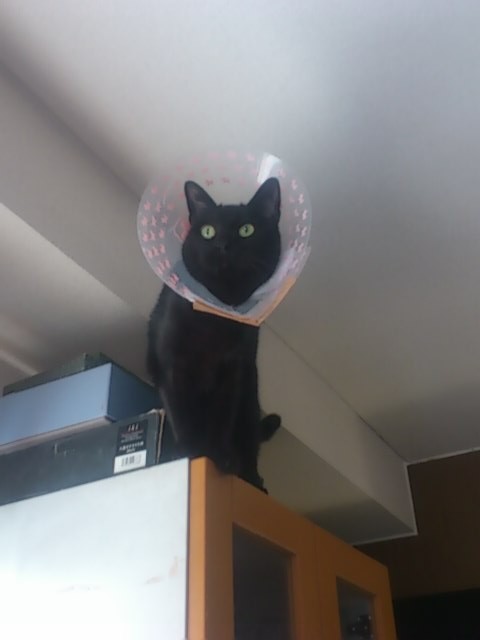 エリザベスカラーを付けたM4号は、その後これを道具として、ブルドーザーのように部屋中、台所中のものに当たり散らし、なぎ倒して生活しています。