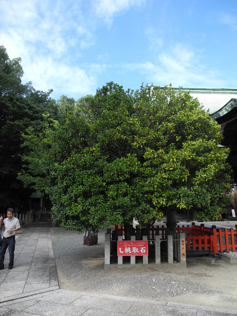 名古屋の本山と覚王山の間くらいにある城山神社は、もと信長のお父さんのお城があったところだそうで立派な神社になっています。ここの境内に、橘の木と桃取り石というのがあるとM2号に聞いて私も見にいってきました。