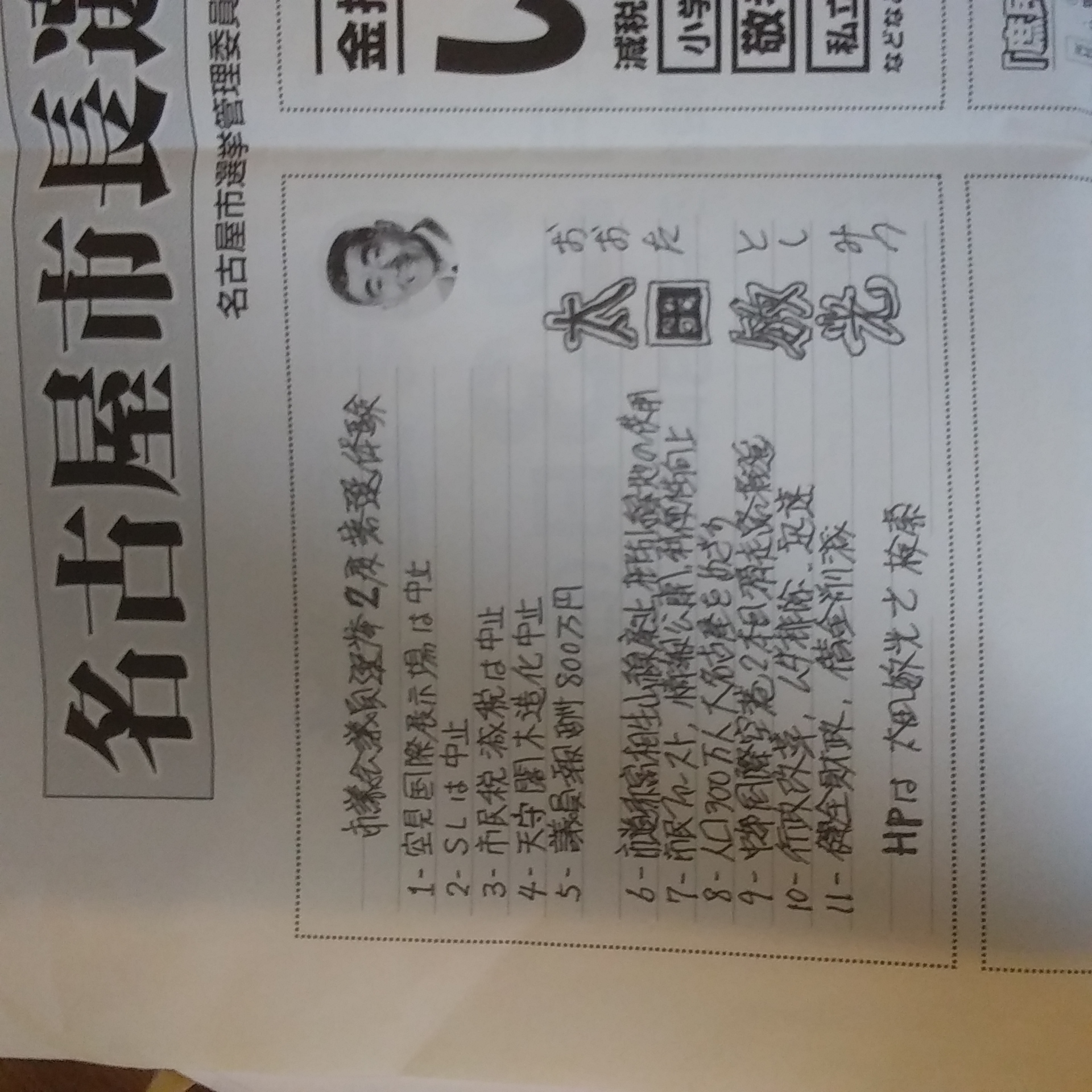市長選挙の候補者紹介のビラにこんな手書きのすごいのがありました。M2号は名前をふちどりしているのに感激していました。