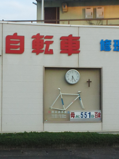 こんな自転車屋さんがありました。百歳までにはまだ一年以上あります。がんばれ母ちゃん。
