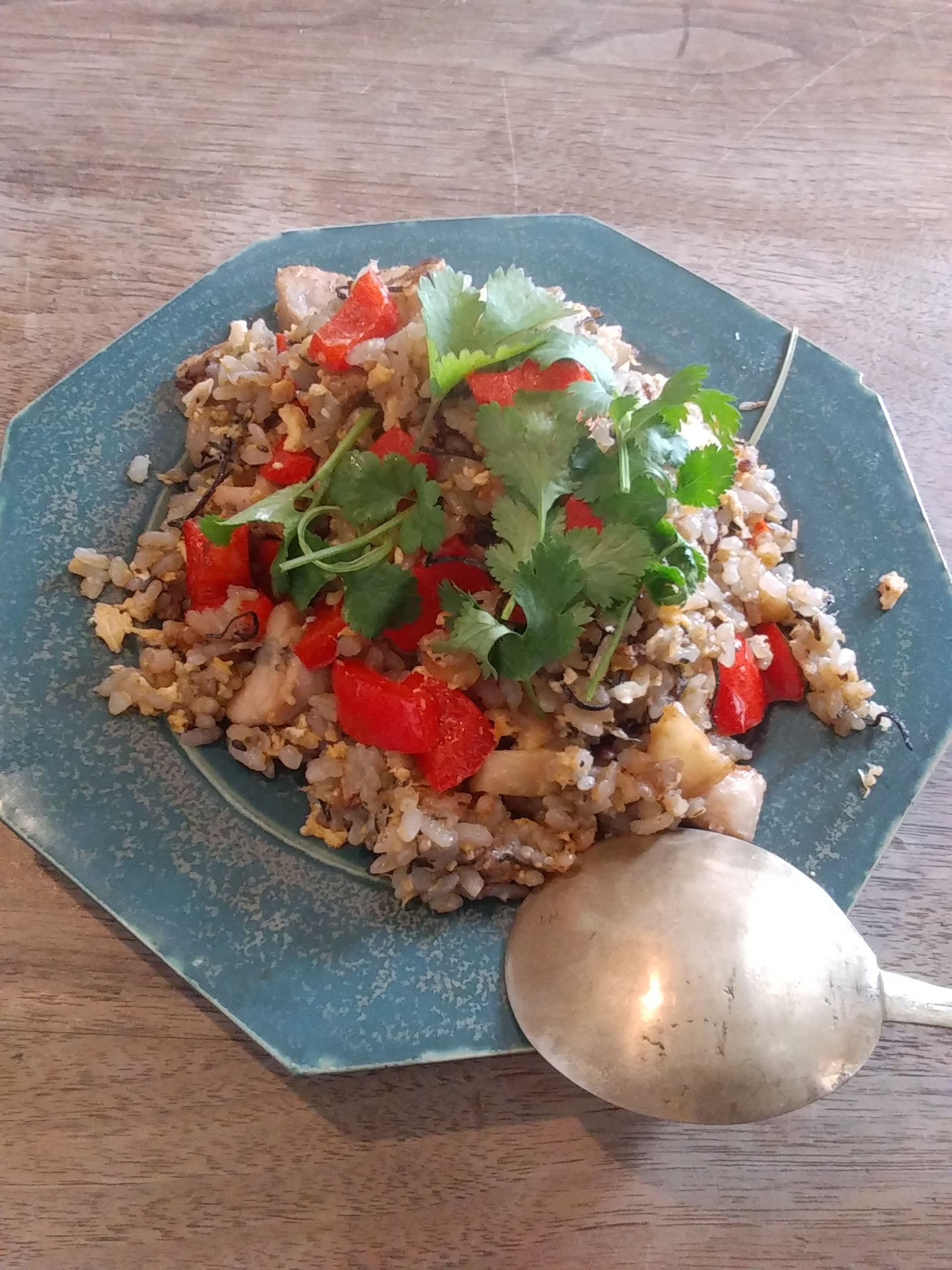(昨年末マレーシアから来た友人からいただいたチンチャロ(オキアミの塩辛)を使って作っています。瓶詰めですが、注意しないとものすごい勢いで吹き出し(爆発し)ます。とても食べられるとは思えない匂いですが炒めると香ばしいいいにおいがします。あとバクテー(肉骨茶)の素が残っています。)