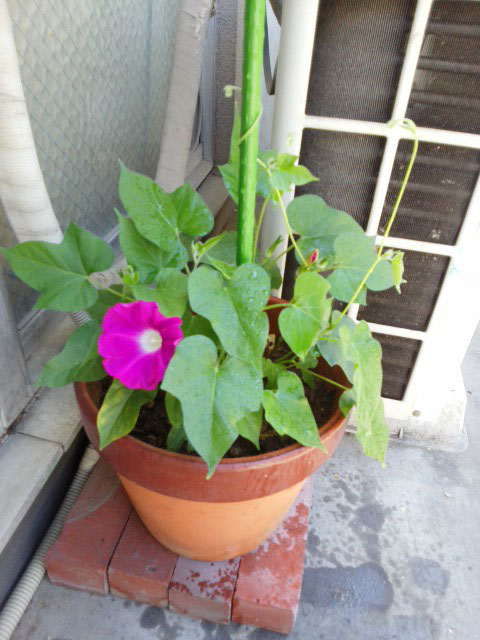M3,4号に食べられないように事務所でそっと育てていた朝顔がつるも伸び始めたところなのにもう花が咲きました。”朝顔につるべとられてもらい水”したいと思っていたのに、とられるつるべを準備する前に咲いてしまいました。小学校以来、自分で育てた植物に花が咲いたのは初めてです。