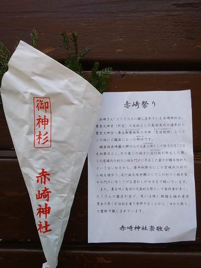 豊受大神宮の外宮さんの末社のひとつである赤崎神社は、鳥羽の加茂川の側にあります6月22日はその赤崎さんのお祭り(赤崎祭)で厄除けの杉が出てくるんだと鳥羽の方にきいたので、お参りがてら行ってきました。