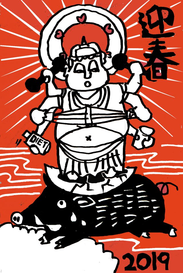 M2号の住宅展示場の仕事が9.10.11日でやっとおわり、その間に止まっていた仕事がやっと今日追いつくめどがつきました。あー、やっと年末が来て来月は正月かという感じです。このブログもやっとまともに書けそうです。とりあえず去年没になった頼まれ年賀状です。猪に乗る摩利支天という方です。心より明ましておめでとうございます。