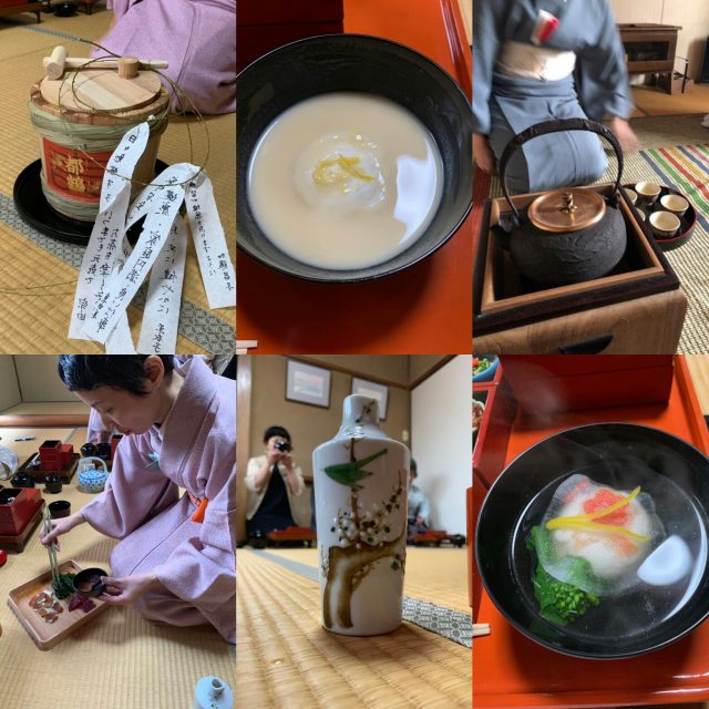 西京みそのお雑煮はMさんとお正月頃に和菓子喫茶で食べた味を参考にして作り、東雲さんのお弁当も添えてとても初釜らしい祝膳になりました