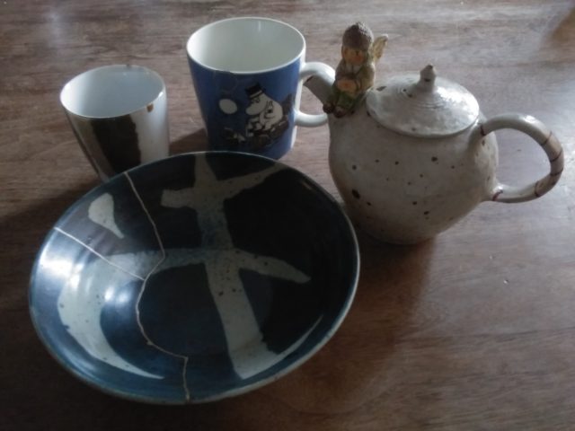 これはご近所さんのZさんにお直ししてもらった器たち、生き返ってうれしいです