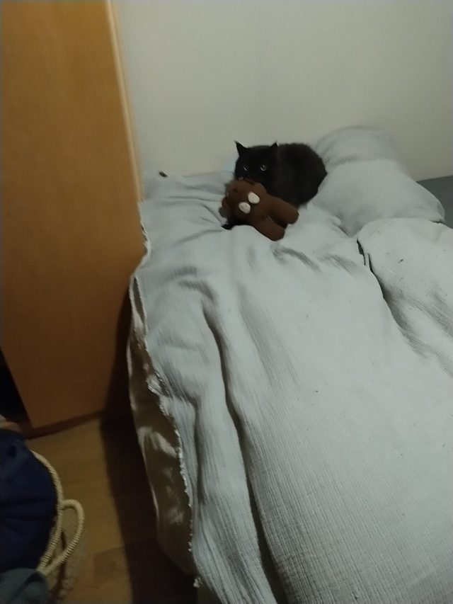 クマと添い寝がお約束のM3号 睡眠に向け助走中 寂しいのか?