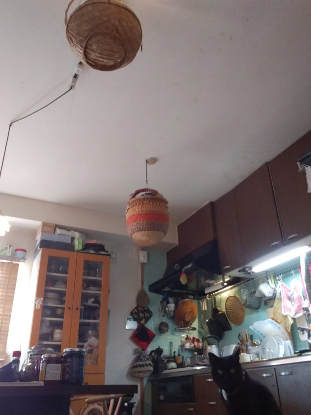 うちの台所は天井からいろいろぶら下がっている、カゴバッグはビニールゴミ。