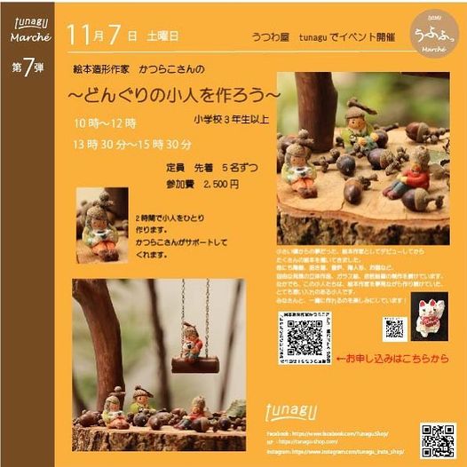 絵本造形作家のかつらこさんがドングリの小人(どんぐりの神様ともいう)をつくるワークショップを開催します ドングリの帽子は本物です!