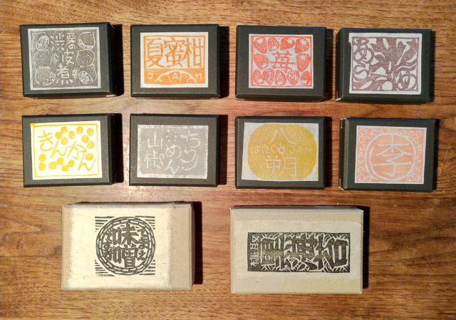 先日のマルシェで用意した小箱がたくさん余ったので、M1号さんのつくる木版ラベル入れてみたらぴったしの箱サイズなのでした