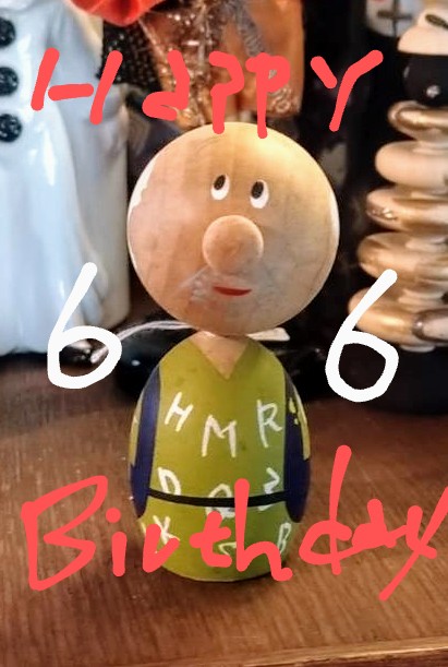 このこけし「フクチャン」という昭和漫画に出てくるおじいさんなんだって🎵 古道具屋さんで見つけて、M1号さんにあまりにも似てて妹と顔合わせて笑った 粋な着物着てますね✨