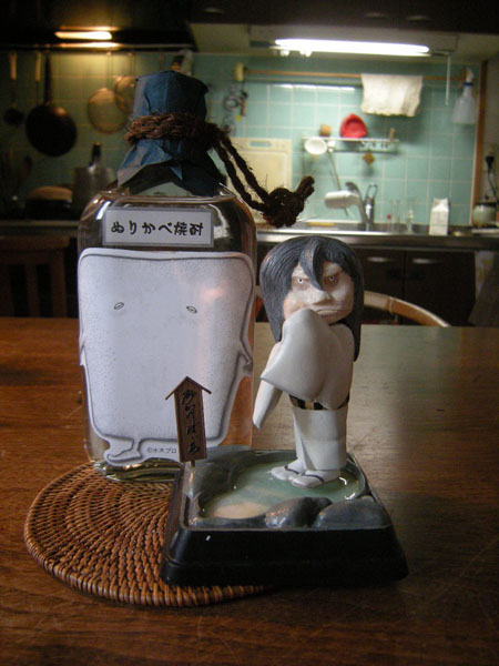 この砂かけばばあのプラモデル、足元は池に水がはってあるよう樹脂が流してあり、看板が電源スイッチになっていて、足元から三日月がぼんやり光るようになってますのよ~