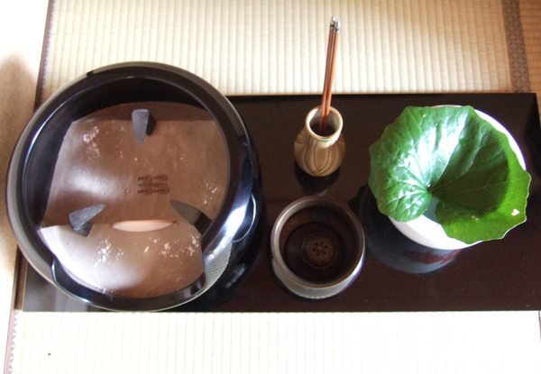 長板のお点前に水差しの蓋を葉蓋にして、”涼”の演出。葉は”石蕗(つわぶき)”を使いました。