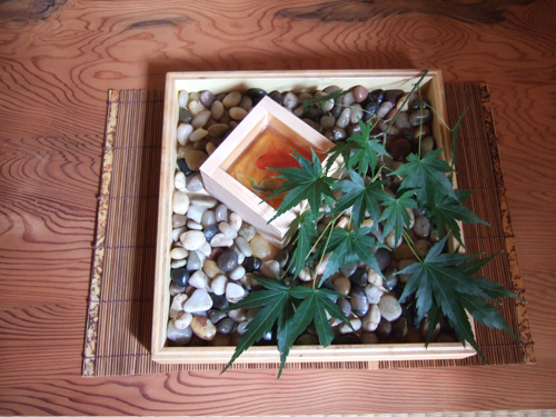 枡に樹脂を流し、そこに金魚が描いてあります。