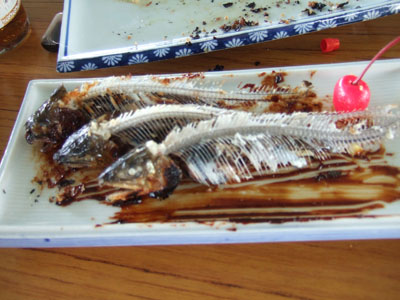 鮎の塩焼き、でんがく、お刺身、甘露煮、フライ、・・・忘れました。とにかく一人10匹くらい食べたようです。”ほかのものも欲しい”と思う私たちにかまわず 鮎・鮎・鮎・・・