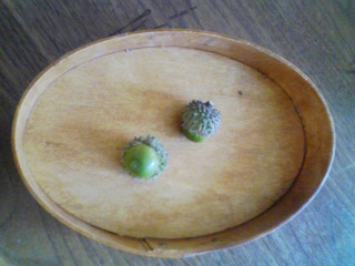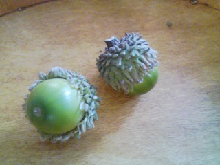 散歩の途中、クヌギの実をもぎってきました。まだ青いですが帽子がかわいらしい。