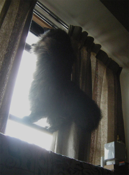 朝、カーテンが少し開いていると窓ガラスから外をのぞこうとするM3号くん