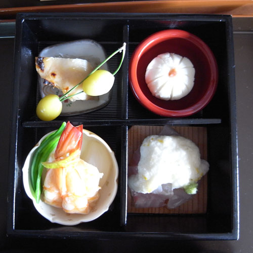 ほんとは焼き物、向付けとかは、器もばらばらでお出ししますが、こんなかわいらしい松花堂風の入れ物に少しずつのせました。