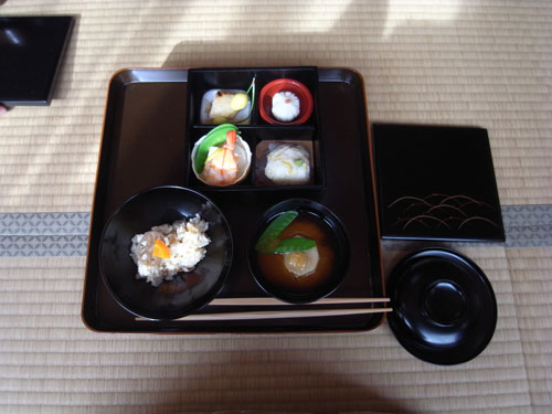 そして当日の簡単懐石のお膳はこんな感じ。一汁三菜(汁・向付け・煮物・焼物)が懐石の基本です。