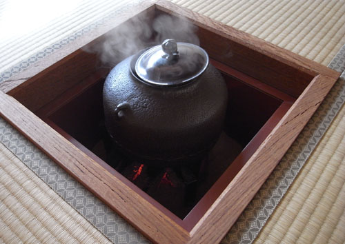 その食事の間に釜から、湯気がふつふつと。