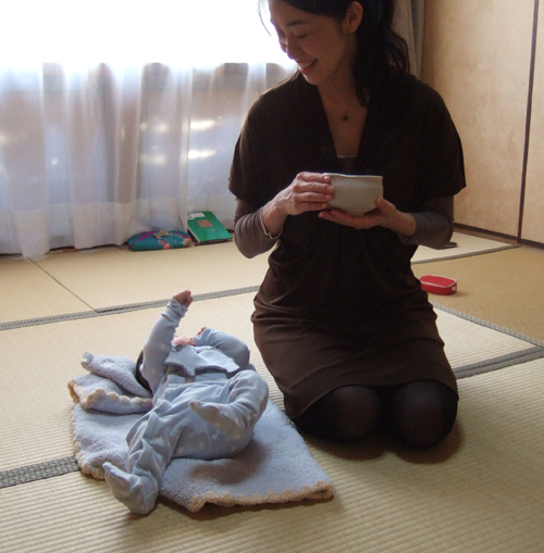 先日、杜鵑草庵に茶道部お稽古仲間のSさんが生まれて3ヵ月になる息子を連れて遊びにいらした。