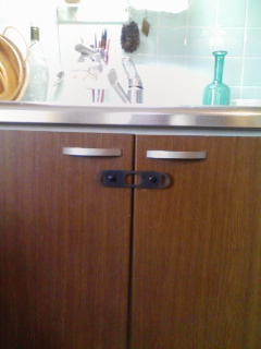 これは流し下扉やコンロや引き出しをバンバンと自由に開け閉めできる小姑M4号対策のためのものなのです。使う頻度も多い場所なので最近では穴が破れてきて、つかいものにならなくなってきました。